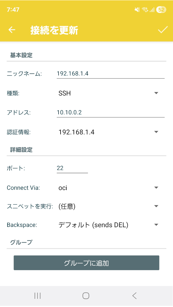 (2) JuiceSSHに、OCIからWireguard経由の自宅サーバー(10.0.0.2)へのSSH接続の設定を行う。