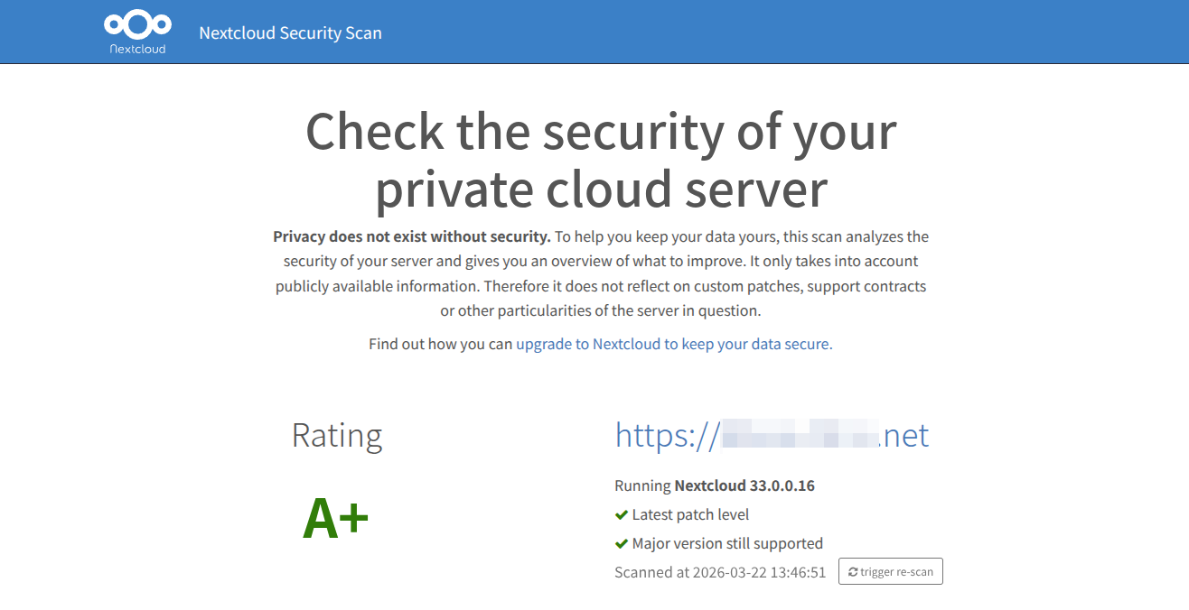 ちなみに、Nextcloud Security Scanを実行してみたところ、セキュリティレベルは最高ランクのA+という判定でした。